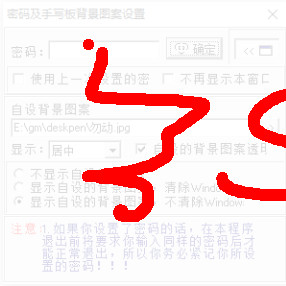 4、同时使用“程序退出时保存密码”和“使用上一次设置的密码”选项,就不用每次启动桌面手写板时都重复的设置密码了。你设置的密码是经过我自己设计的不可逆加密算法加密后才保存在deskpen、ini配置文件中的,密码虽然能在deskpen、ini找到,但已和你原来输入的密码完全不同 了,所以你不用担心你的密码会让别人知道。密码的最大长度是12,可以使用英文字母或阿拉伯数字或其他可以用键盘输入的字符。如果你发现你能通过保存在 deskpen、ini配置文件中的经过不可逆加密算法加密后的密码猜出原先的密码的话,请你告诉我。