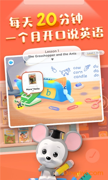 腾讯开心鼠英语启蒙课ios版是腾讯旗下专门针对少儿英语启蒙设计的学英语app,课程设计深入浅出,循序渐进的学习各种知识,画面色彩丰富鲜艳,牢牢的抓住了孩子们的注意力,玩中学才是最佳的启蒙方式!