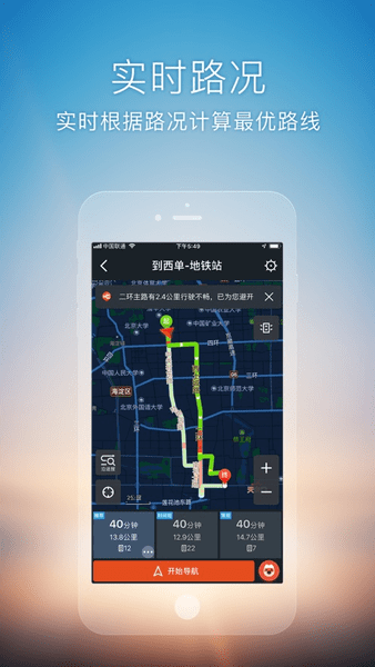 6、自驾导航结合实时路况提供躲避拥堵的多方案参考,支持不走高速、避开收费、外地小客车限行的策略选择,并且在导航过程中可根据路况变化实时避堵,绕开突发拥堵路段;