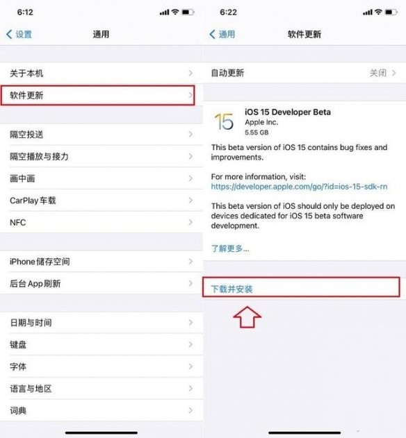3.安装完成并重启后,打开 iPhone 的「设置」->「通用」->「软件更新」,之后就可以在线检测到iOS 15最新测试版系统更新了,之后再点击下方的「下载并安装」根据提示,在WiFi网络下,就可以根据完成OTA在线升级系统。