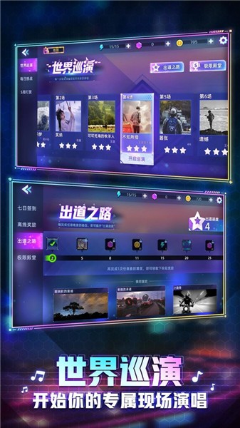 1、这款游戏的玩法是充满了挑战性的音乐类闯关玩法,画面的色彩搭配也很炫酷的哦。