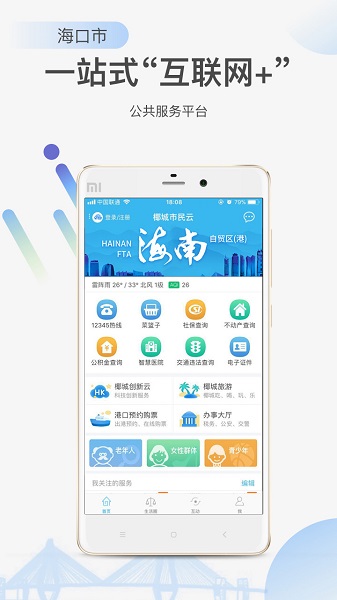 椰城市民云是海口市以市民为中心的一站式“互联网+”公共服务平台,市民通过椰城市民云这一个入口,就能“一号通行”,畅享所有政府服务。
