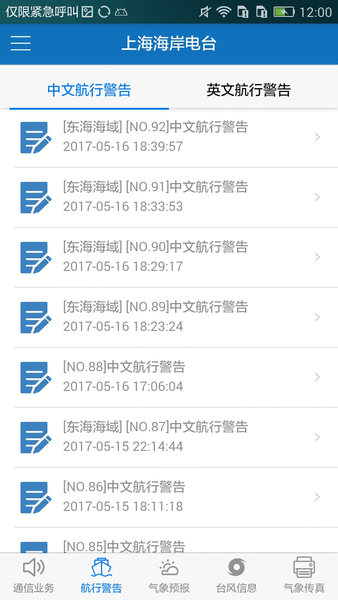 上海海岸电台最新版进行海上无线电传真,为海上航运船只提供海上气象报告、气象台风警告、航行警告、气象传真图等安全信息,更加保障了海上航运的安全性和稳定性。保障航海安全,为更多航海人的安全护航。航海要安全,提前了解天气情况,才是重中之重,想要实现航海远航,随时了解海面变化,紧急避险是关键。