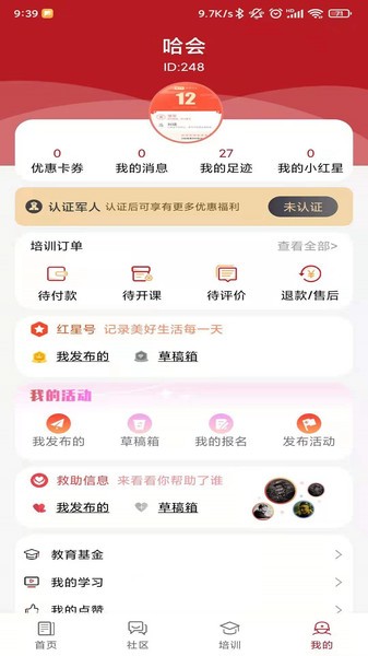 我的页面中,是个人信息、我的消息、我的足迹、培训订单、红星号、我的学习、我的点赞等功能展示。
