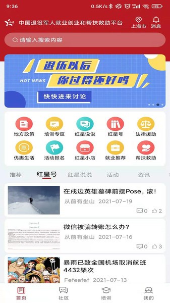 红星网最新版是专为退伍军人打造的再就业培训和帮扶平台,让用户可以随时在这里学习想学的技能,还有相关的创业政策在这里可以进行了解,帮助退伍军人可以更加轻松的找到工作融入社会。