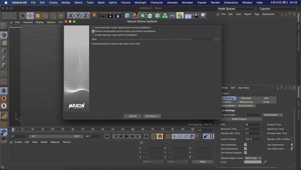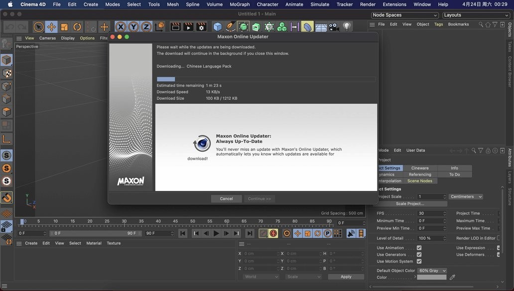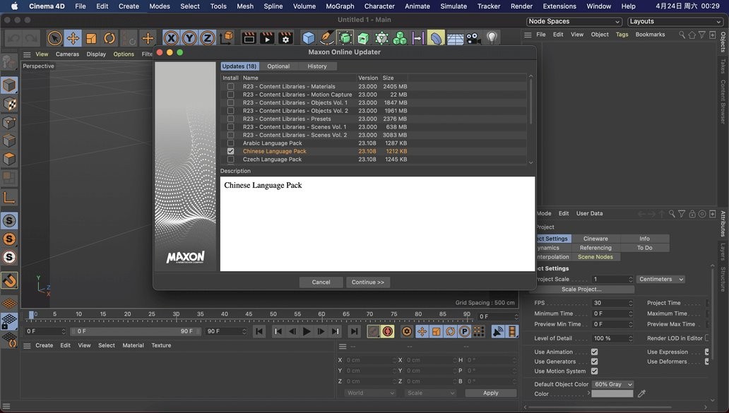 在 maxon online updater 界面勾选 chinese language pack 然后点击 continue