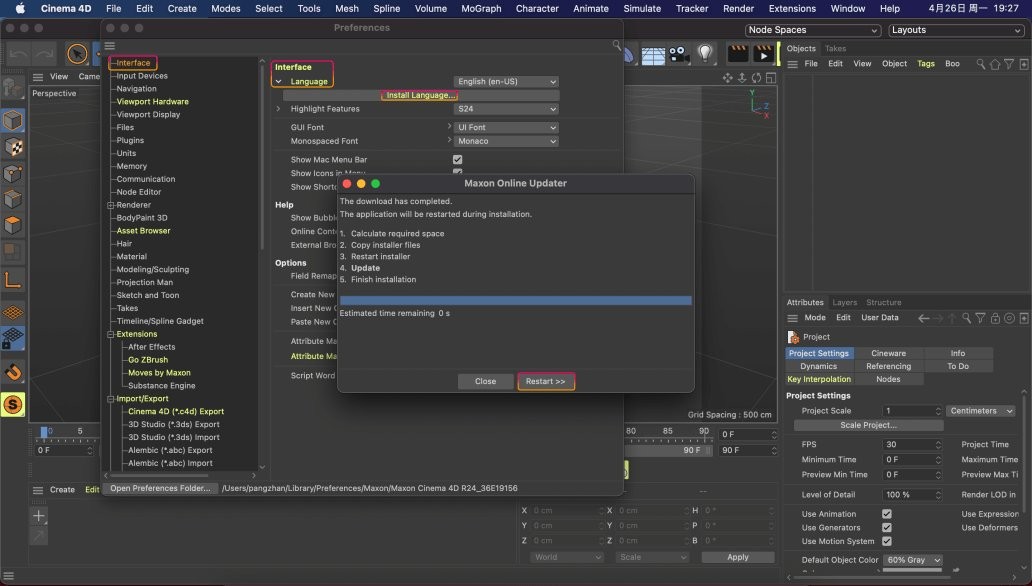 maxon cinema 4d studio for mac设置中文语言的方式与上面版本不同,设置如下