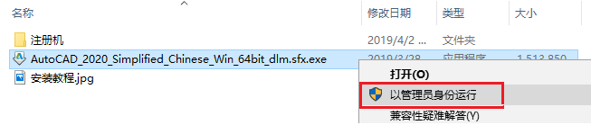 1、先使用“百度网盘客户端”下载CAD_2020软件安装包(含注册机)到电脑磁盘里,并解压缩,安装前先断开电脑网络,然后在文件夹内找到AutoCAD_2020_Simplified_Chinese_Win_64bit_dlm.sfx.exe,鼠标右击选择【以管理员身份运行】