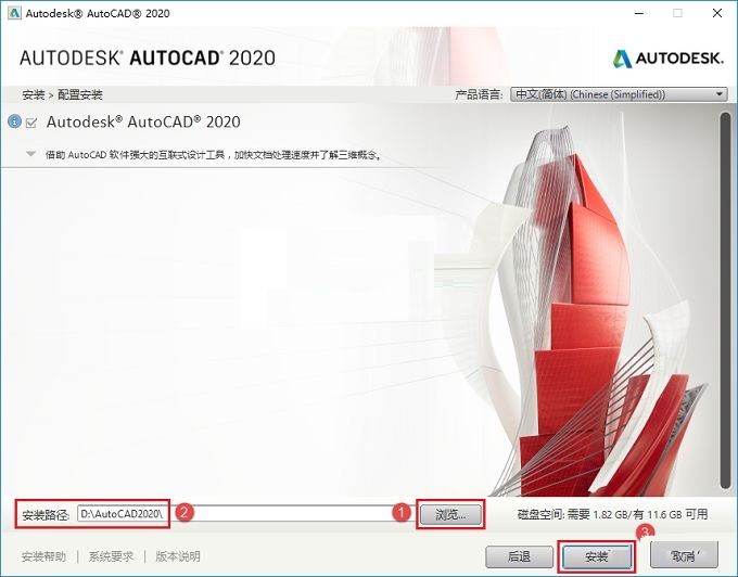 6、选择软件安装路径,默认安装在C盘,点击【浏览】可更改软件安装路径,注意:安装路径文件夹名称不能出现中文字符!小编这里将安装在D盘AutoCAD2020文件夹下,然后点击【安装】
