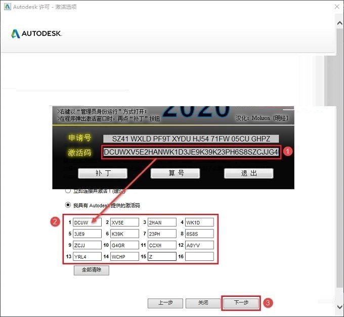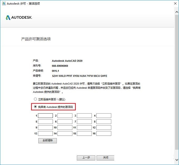 19、首先勾选“我具有Autodesk提供的激活码”,不要着急点击“下一步”,下面我们通过注册机来生成激活码