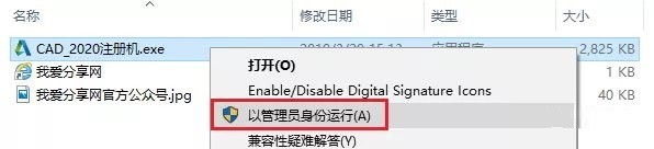 21、找到CAD_2020注册机.exe,鼠标右击选择【以管理员身份运行】,注意:一定要“以管理员身份运行”注册机,不然会激活失败