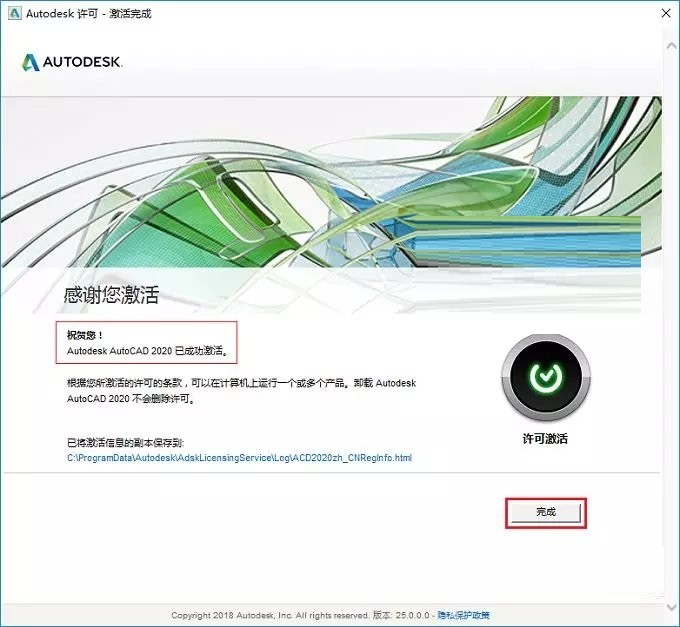25、提示AutoCAD 2020激活成功,然后点击【退出】按钮关闭注册机,再点击【完成】