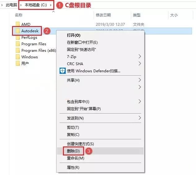 27、打开C盘,找到根目录下(对应第2步的位置)名为Autodesk文件夹,鼠标右击选择【删除】删除已经无效的安装文件,安装最新完成。
