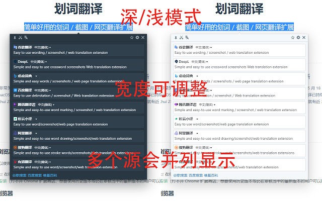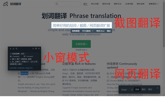 一个简便但强大的划词翻译类插件。支持谷歌、百度、有道三大翻译和朗读引擎,可以方便的查看、复制和朗读不同引擎的翻译结果。支持几乎所有语言的翻译与阅读,并且同时支持国内与国外的谷歌翻译;划词即显示翻译结果,简单方便。可以指定目标语言,例如从中文翻译到法语;支持在 PDF 文档里使用;自带多种网页翻译,弥补国内Chrome网页翻译总是出错的不足;