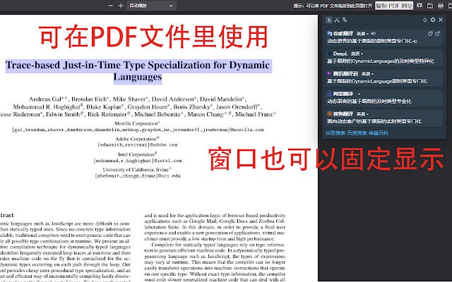 默认使用弹窗在文本附近显示翻译结果,也可以固定在一处显示。内置了 PDF 阅读器,让你能在 PDF 文件(包括你电脑里的 PDF)上使用划词翻译。