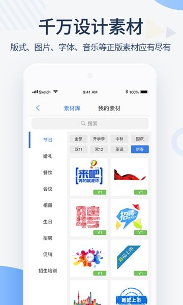 海报、h5制作、视频等设计模版应有尽有,千万款设计素材,细致到版式、图片、字体、音乐等正版素材。