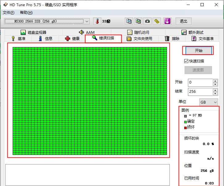 4、扫描过程中,绿色小方块代表好,红色小方块代表损坏来检测硬盘坏道,如下图: