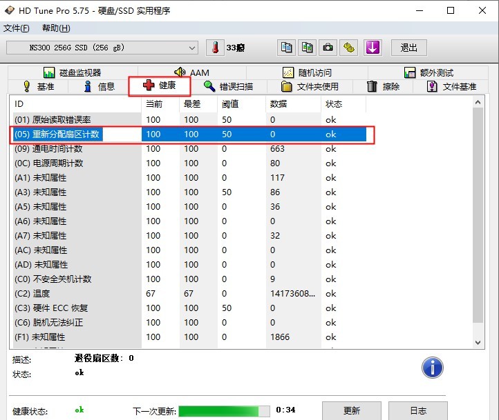3、鼠标左键单击想要了解详细说明的数据,屏幕下方的描述及状态数据就是磁盘健康状态详细说明,如下图: