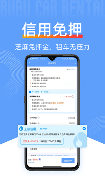 信用免押,芝麻分满650.即有机会享免押租车,开启信用免押新时代。