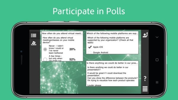 adobe connect 安卓版可以参加会议,网络研讨会和虚拟教室。查看和参与,展示内容,甚至完全主持在线会议。 (主持会议需要一个adobe connect帐户。)