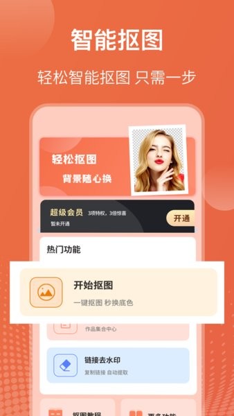 一键智能抠图,轻松更换背景!无须任何P图技巧,简单几步,轻松抠出图像,支持人像、各类商品、物品、衣服、动植物、图章等识别,生成透明背景图,在手机上也能抠出完美效果。