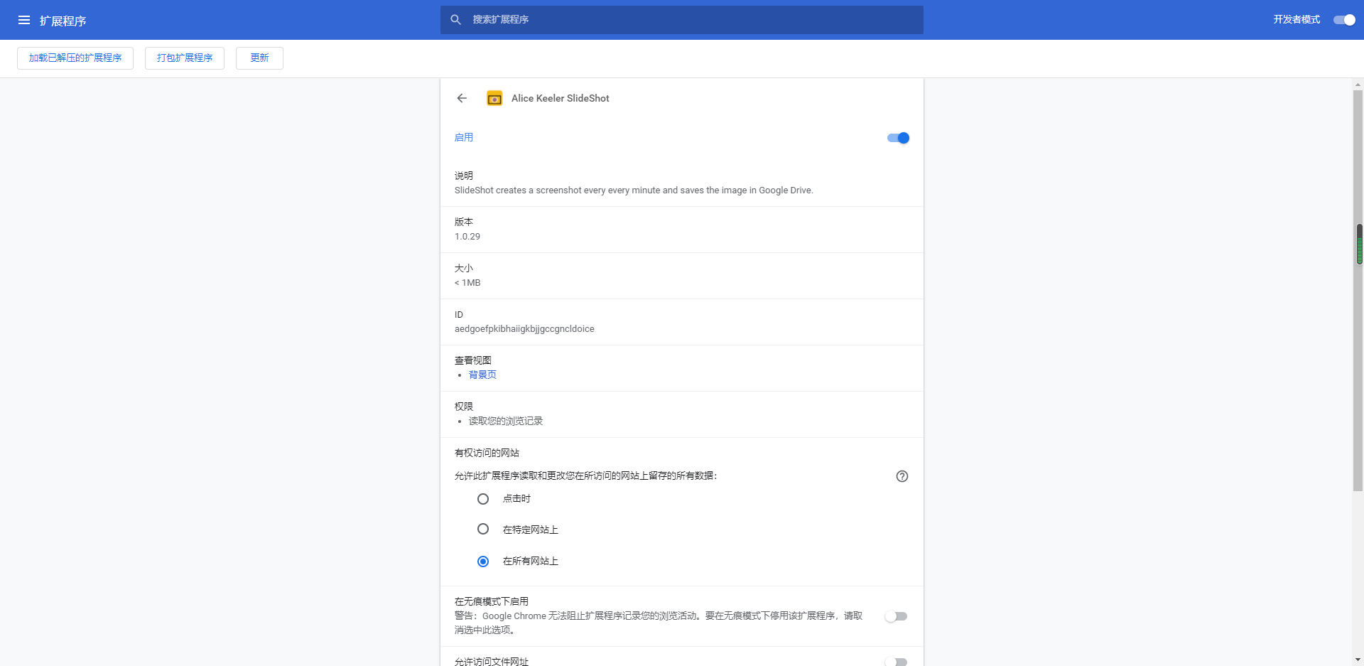 SlideShot 每分钟创建一个屏幕截图并将图像保存在 Google Drive 中。选择完成,屏幕截图会自动导入到 Google 幻灯片演示文稿中。每张幻灯片一张屏幕截图。幻灯片演示文稿可以在 Google Drive SlideShot 文件夹中找到。建议使用 Drive 中的“最近”过滤器快速定位。