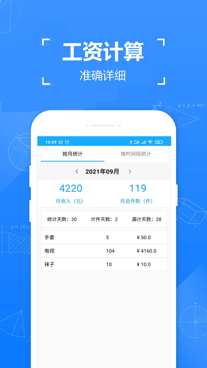 3、统计图标,多维度时间段统计;工资计算,准确详细;专业计件,你的劳动,记录清晰。