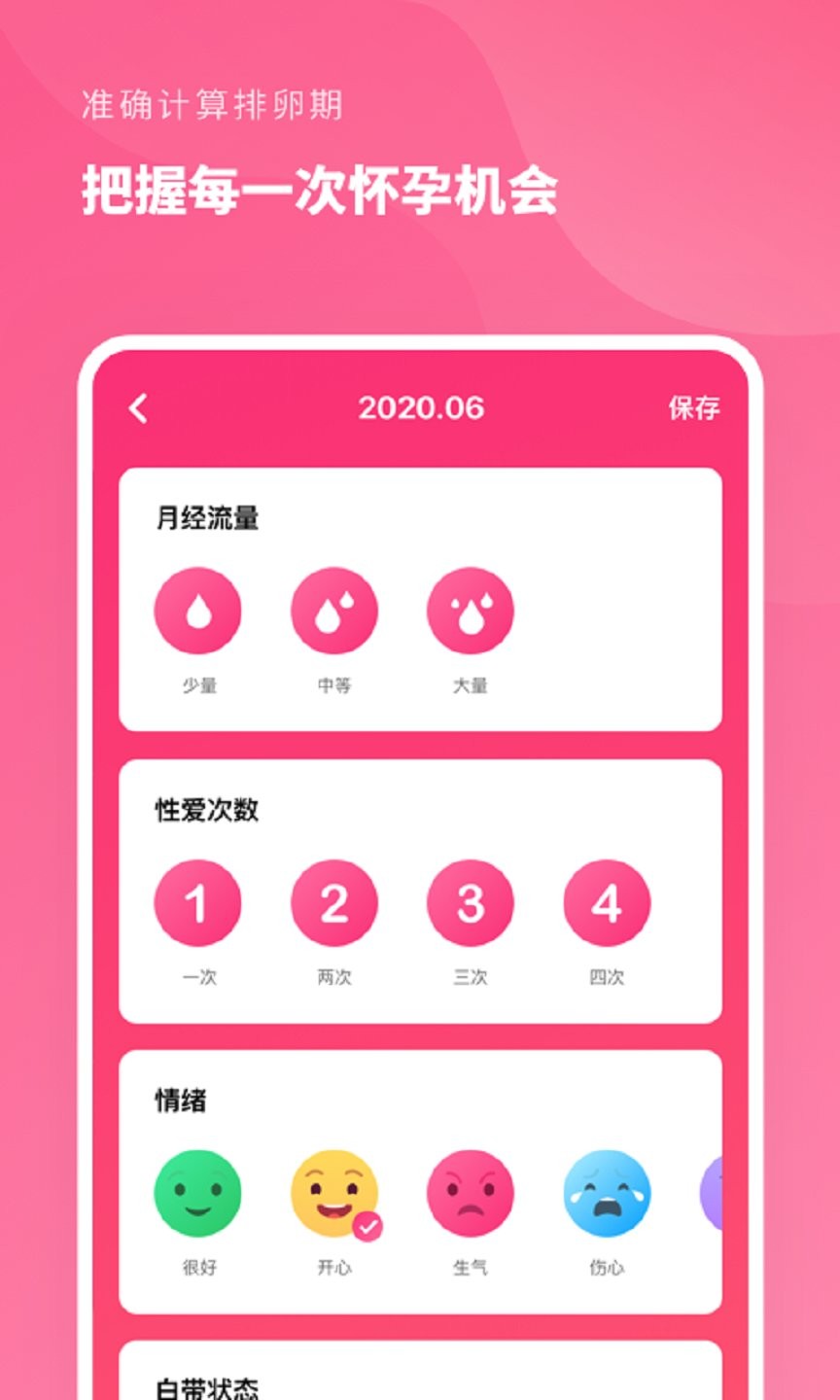 全面记录和跟踪生理周期,科学计算排卵期、安全期、时间,准备充分的怀孕,可以记录您的所有内容,保存您图片或共享您的内容,专为孕妇设计,可以了解自己最近的身体状况,满足众多用户的备孕的需求,提供很多的帮助。