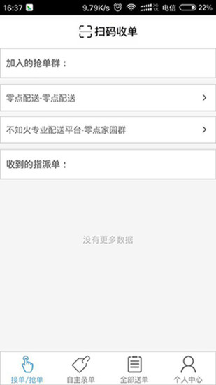 1.接单、抢单版块新增了扫码收单,加入的抢单群、收到的指派单;