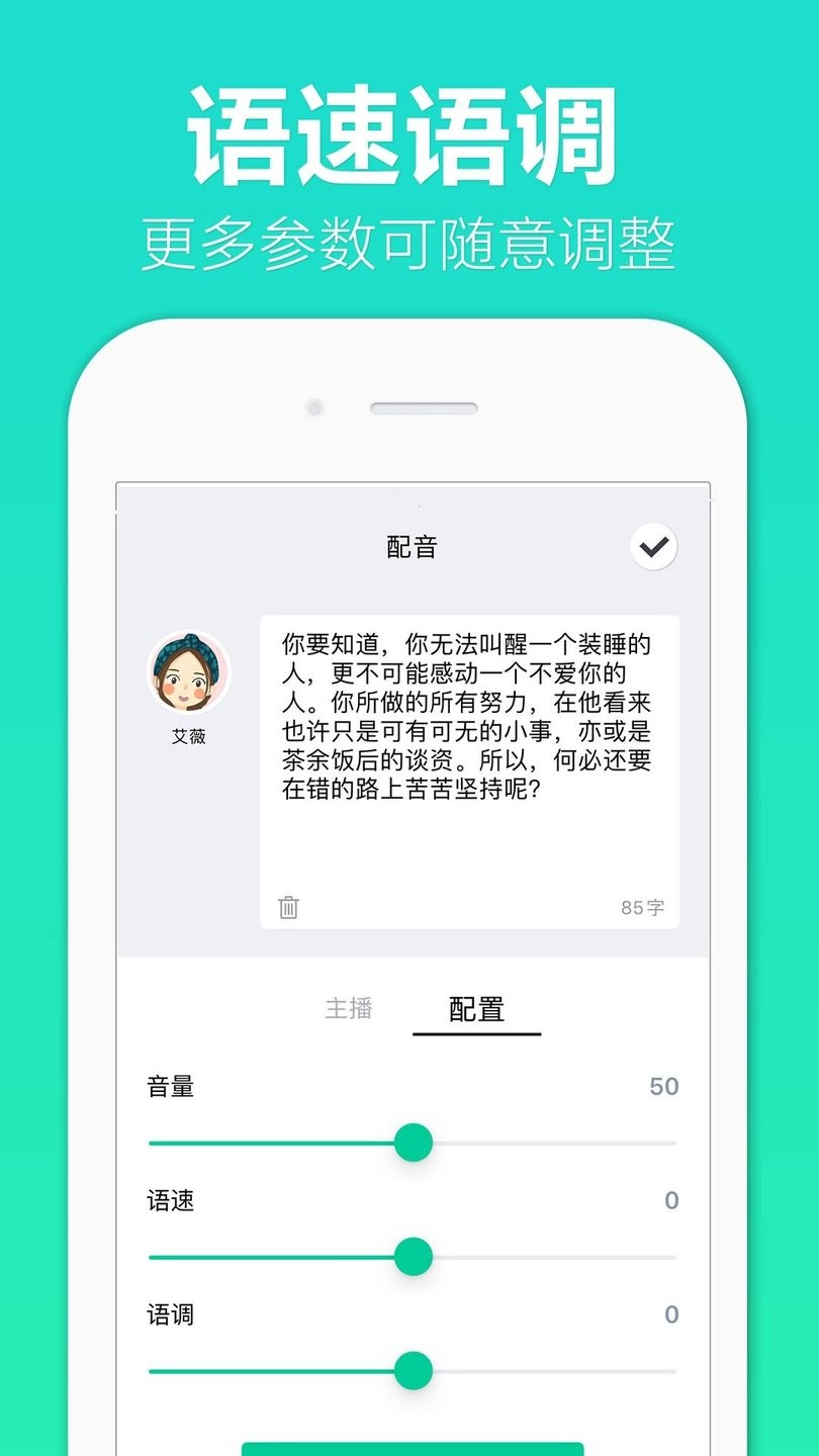 支持配置语音速度,语调,音量大小的调节,方便的个性化定制自己想要的声音,灵活自如。