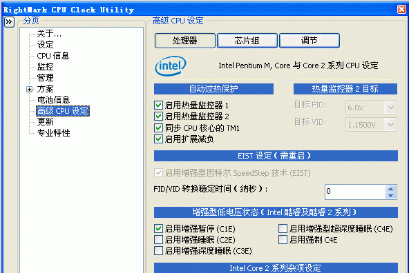 过于频繁的调整CPU对其寿命无益,RMClock设有调频最小间隙。 保障不同频率平稳过渡,延长机器使用寿命保障电池正常使用。 RMClock有锁定计算机电压的功能,比如在使用电池时,运行大程序时可以锁定电压为最大。