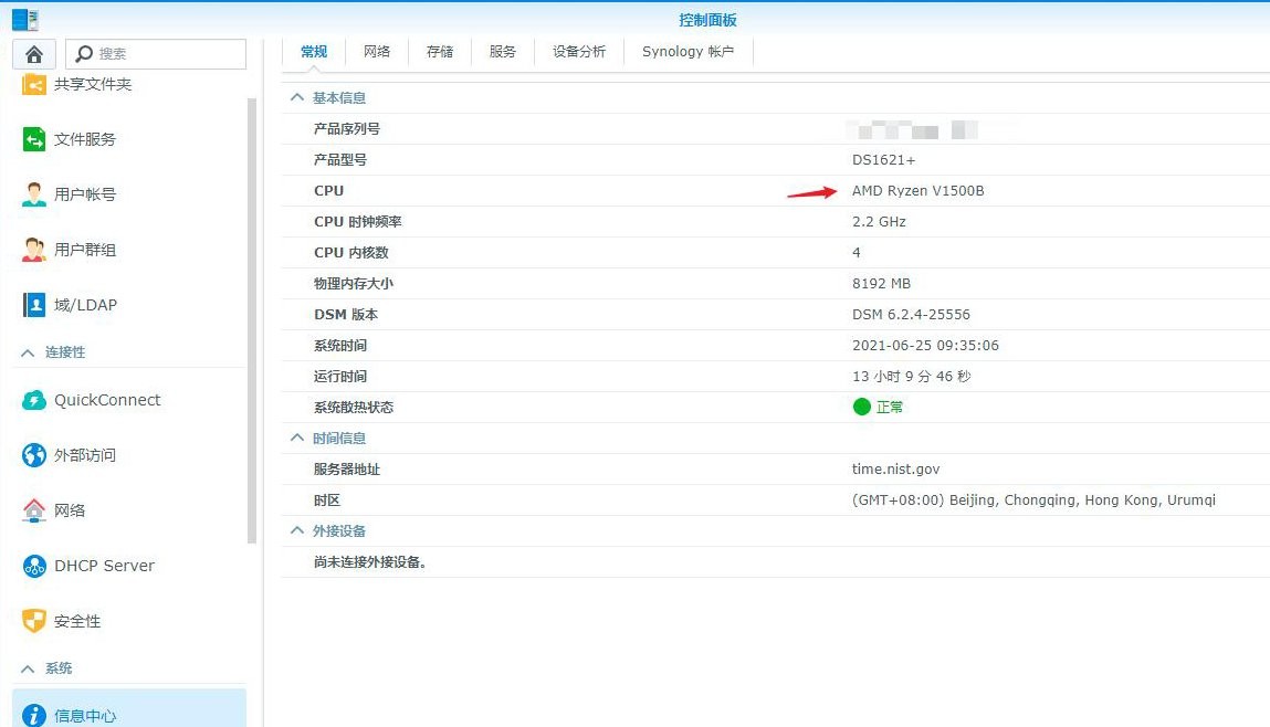 打开群晖管理后台--【控制面板】--【信息中心】--CPU