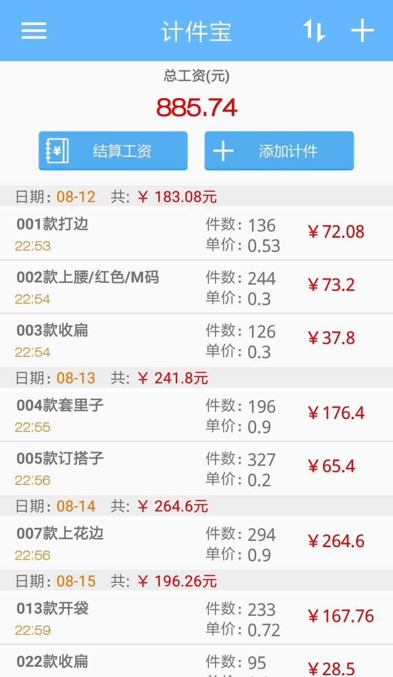 计件宝是一款用于制衣计件的APP,简单易用,解决了笔和纸记帐带来的不便,用户在输入数量和单价等相关信息后,软件将会自动为您列出累计金额,件数单价一目了然,使用起来非常方便!