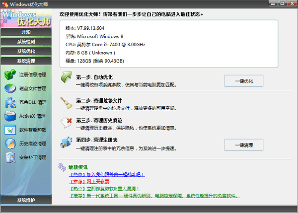 windows优化大师深入系统底层,分析用户电脑,提供详细准确的硬件、软件信息,并根据检测结果向用户提供系统性能进一步提高的建议。