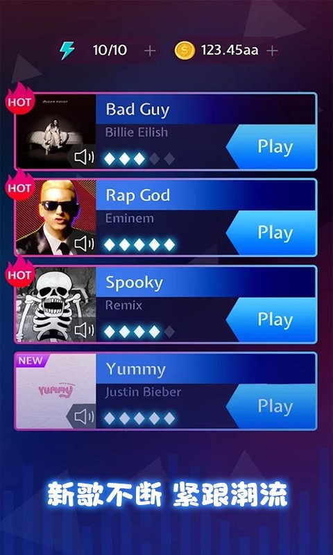 --不同的歌曲根据难度获得星级和奖牌;