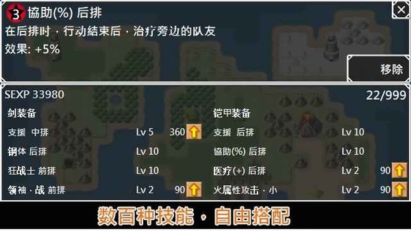 1、多种类型的技能,依战斗位置发动、加自身能力、攻击时发动、战斗結束后发动,数百种技能,任君选择搭配。
