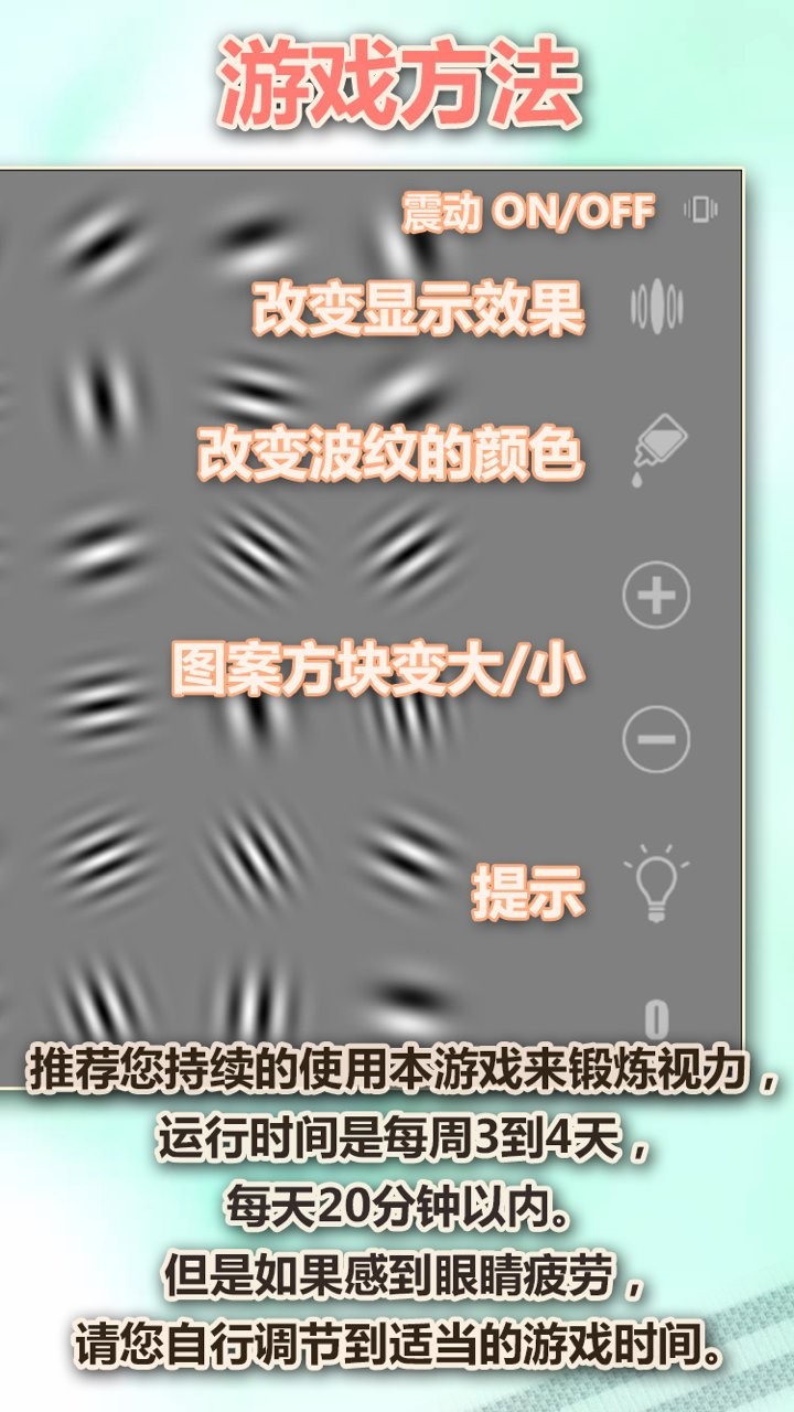 --推荐您持续的使用本游戏来锻炼视力,运行时间是每周3到4天,每天20分钟以内。