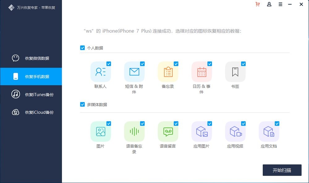 第二步:连接成功后,软件界面会展现所支持的数据类型,分别是“个人数据”和“多媒体数据”,默认勾选的是全部数据类型,用户也可以根据自己的目标数据类型选择一种或者多种类型,然后点击“开始扫描”按钮。