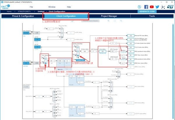 时钟配置采用图形配置,直观简单。各个外设时钟一目了然。STM32F429最高时钟为180M,此处只有在HCLK处输入72,软件即可自动配置。(RCC选择外部高速时钟)。