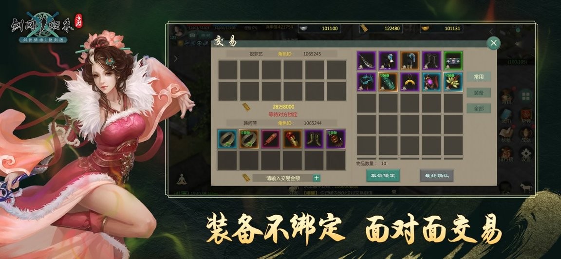 【装备不绑定,真正自由交易】所有掉落的装备不绑定,玩家可一对一交易,亦可摆摊交易,赚取银票;帮会抢首领赢道具,拍卖道具均分金币;
