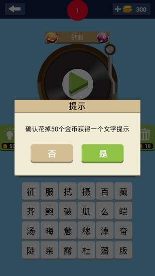 1、通过聆听歌曲片段来猜歌名,玩家点击候选区域的文字,则文字会进入空白答案框;