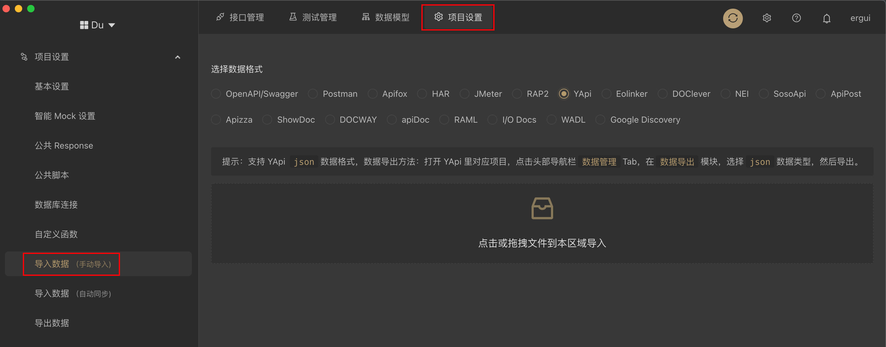 apifox - 接口管理 - 导入,选择数据格式为YApi,导入json文件