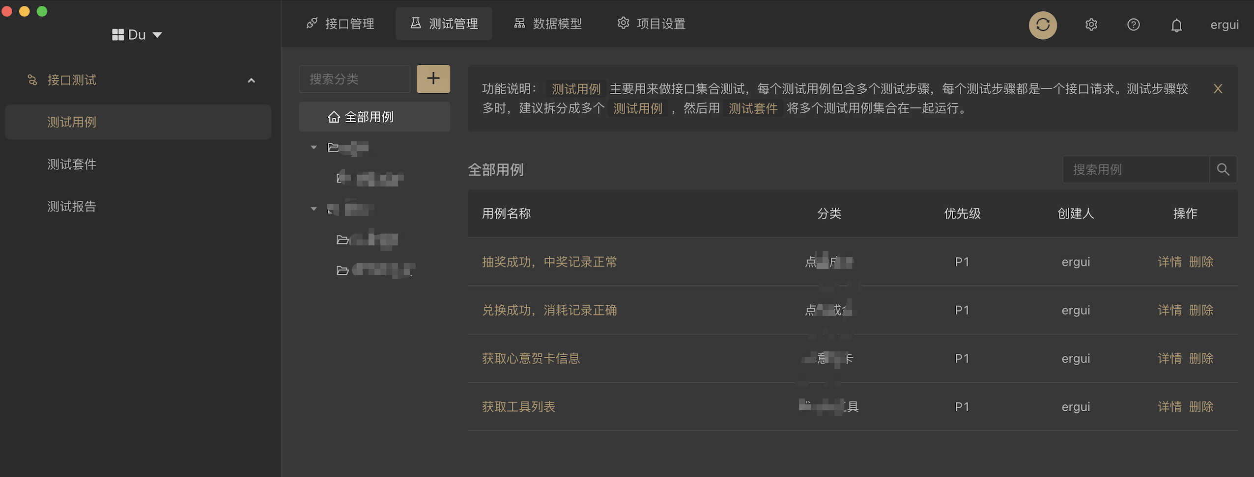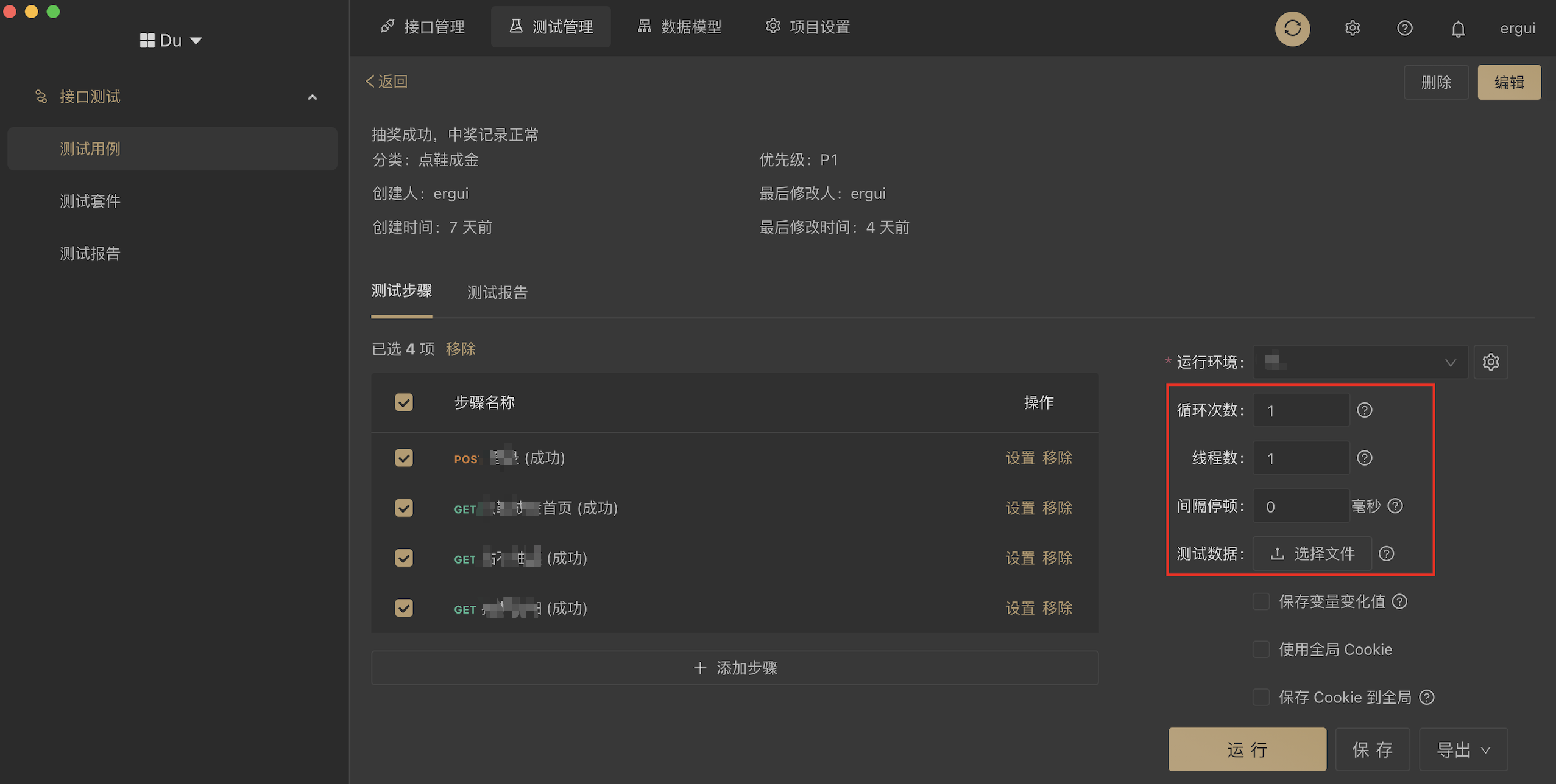 测试用例主要用来做接口集合测试,每个用例包含多个测试步骤,每个步骤都是一个接口请求