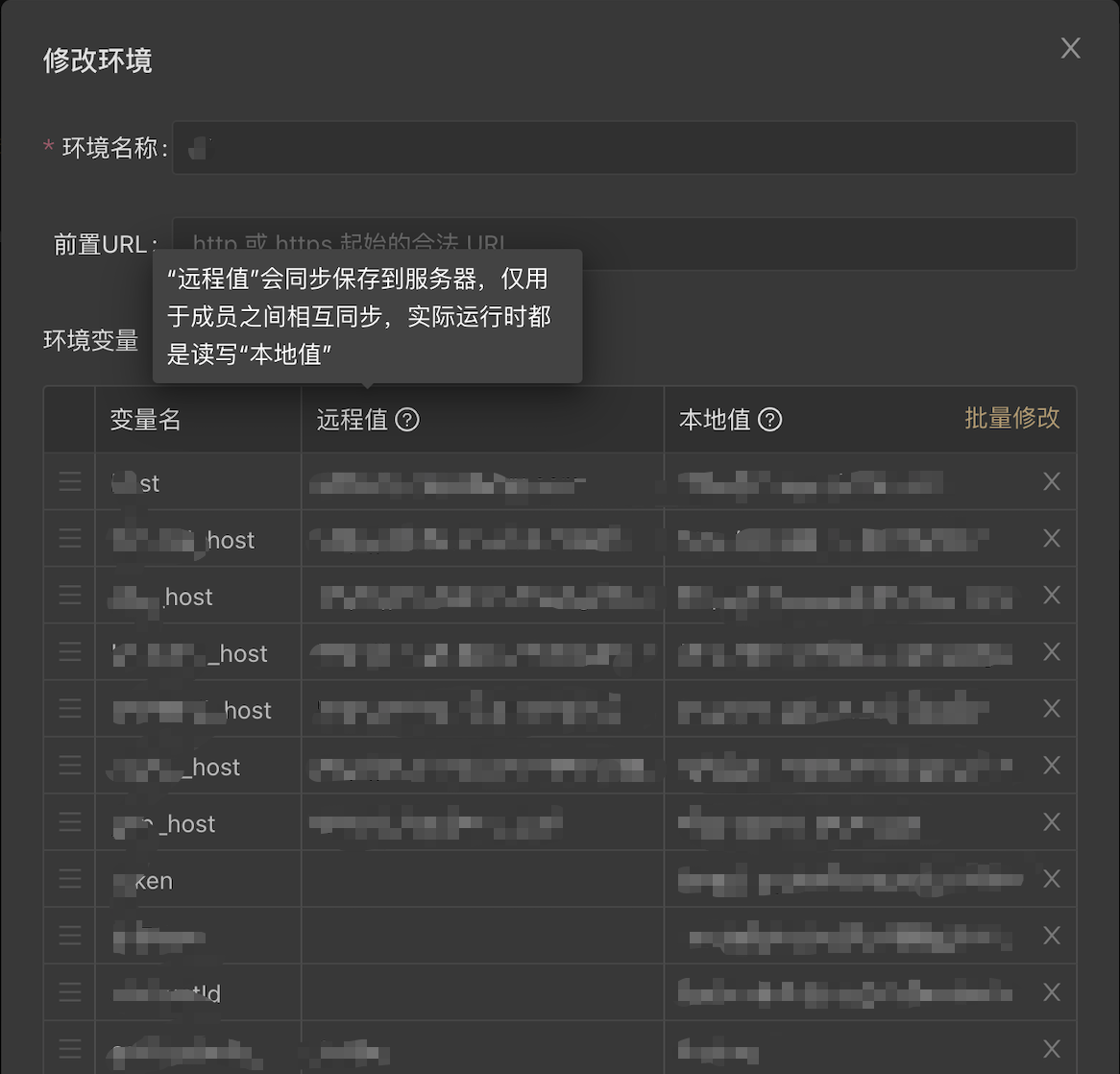 自己的测试数据可配置本地值:“本地值”仅保存在本地,不会同步到服务器,团队成员之间也不会相互同步