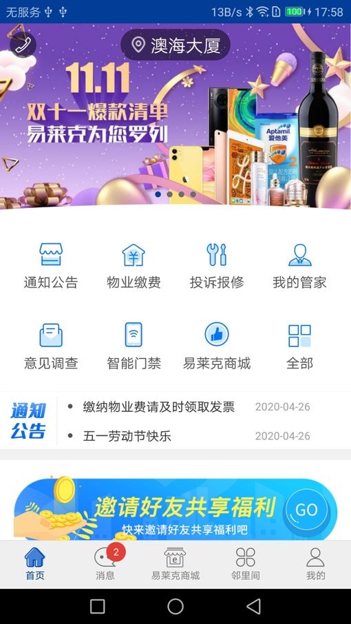 澳海会app是款社区服务手机软件,用户可以在这里查看最新的社区消息资讯,进行物业缴费、报修和购物,让您的社区生活更便捷和快乐。