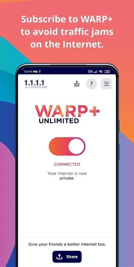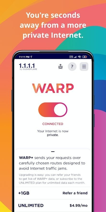 1.1.1.1 application是免费的,但WARP+ 是付费功能,可以随时启用。
