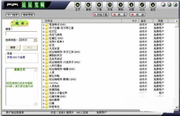 屁屁宽频把风靡全世界的点对点技术带给了国内互联网用户,只要你安装运行了屁屁宽频,就能得到网络里面几乎无穷的电影令你的带宽得到最最充分的利用。