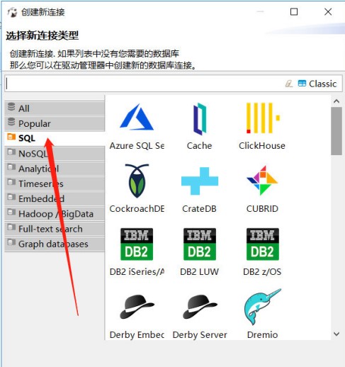 2、选择SQL数据库类型;