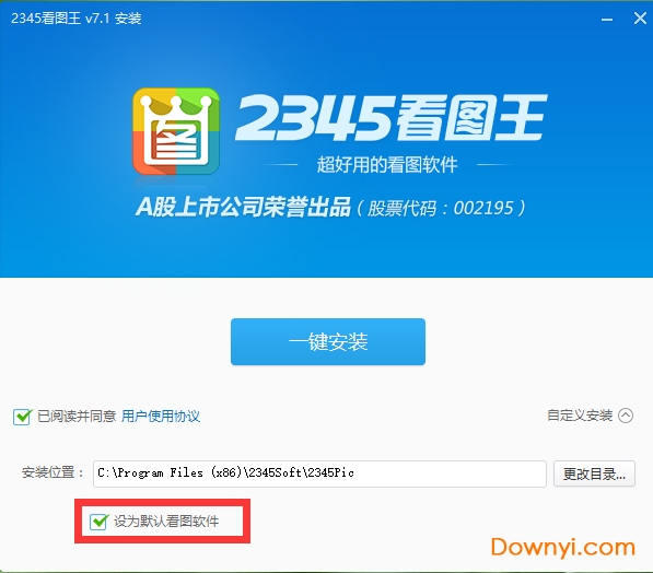 2、用户可以点击界面的一键安装选项,软件会被默认安装到系统c盘中,或者用户点击界面右下角的自定义安装,然后在下方会弹出安装位置选择框,用户点击更改目录选择合适的安装位置,在下方还有默认勾选的设为默认看图软件的选项,用户如果不需要的话可以取消勾选,然后点击一键安装选项。