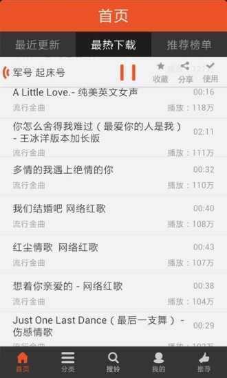 手机铃声全部永久免费!微博,微信,短信分享你最喜欢的铃声,短信,闹铃!轻松点击免费欣赏和设置铃声!最热铃声导航热播电视剧韩剧《来自星星的你》等主题曲插曲热门综艺《爸爸去哪儿》《我是歌手》等等热点新闻“东莞不要相信眼泪”春晚热门单曲“时间都去哪儿了”更有神曲“狐狸叫”“请开门”等等。